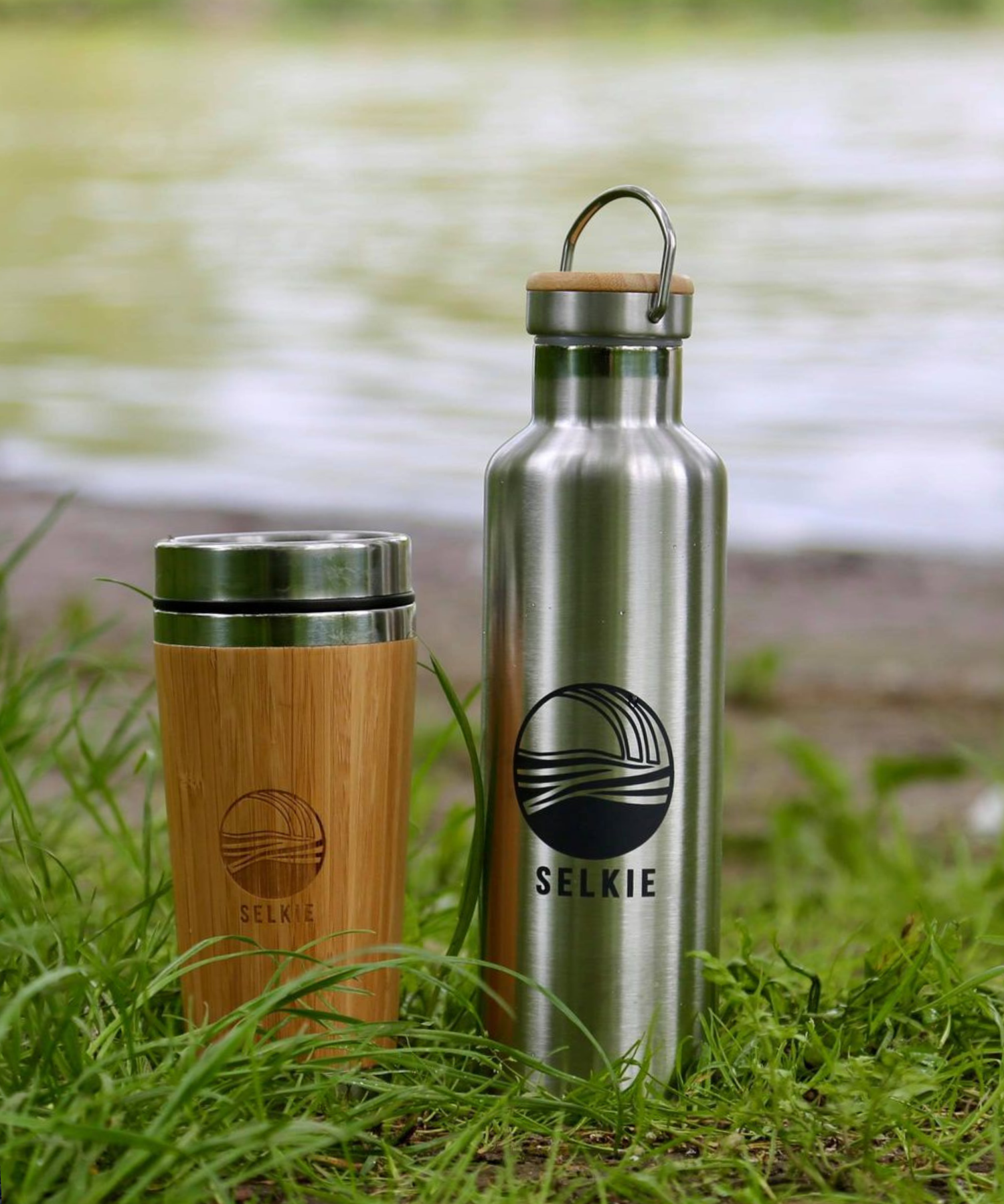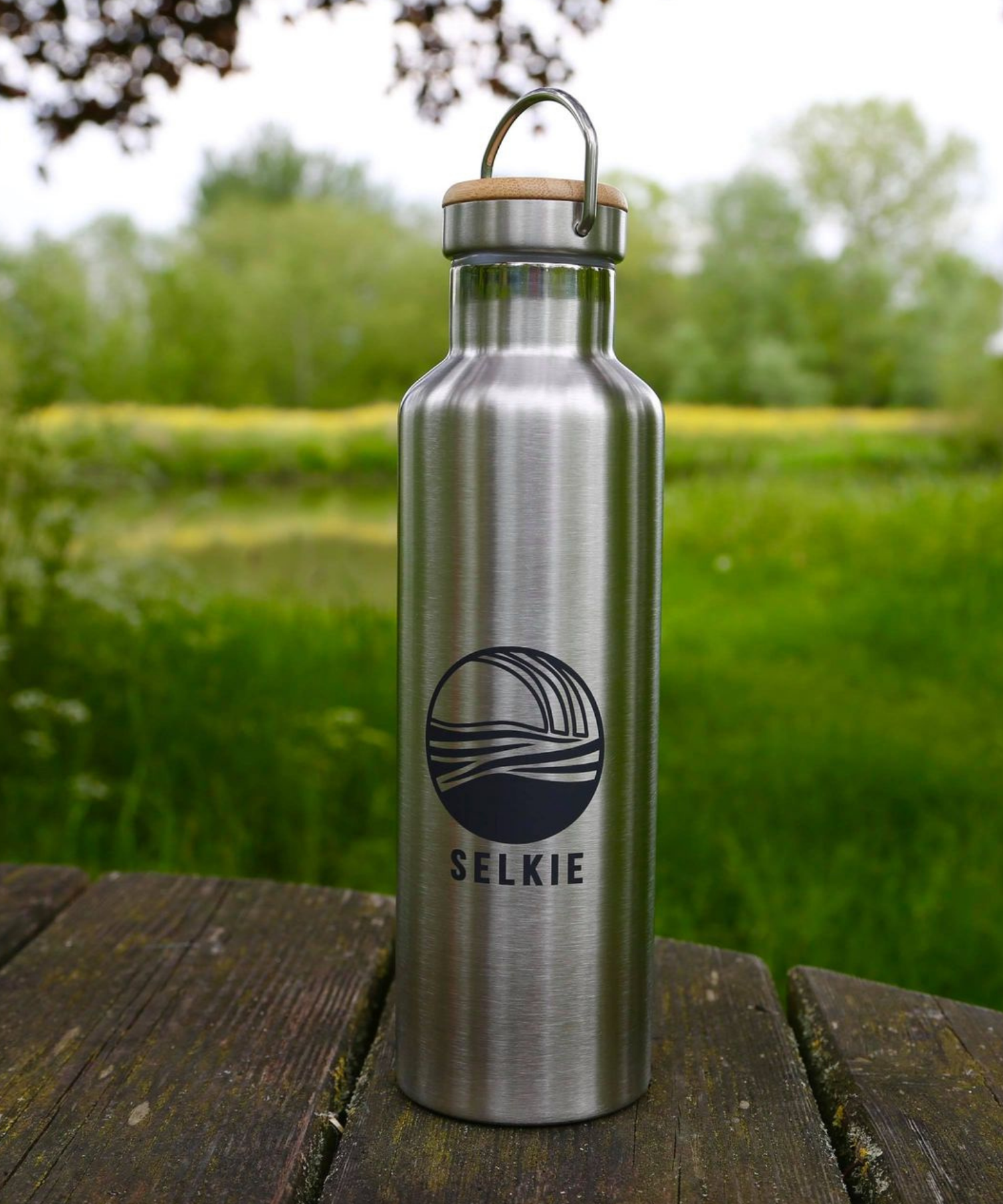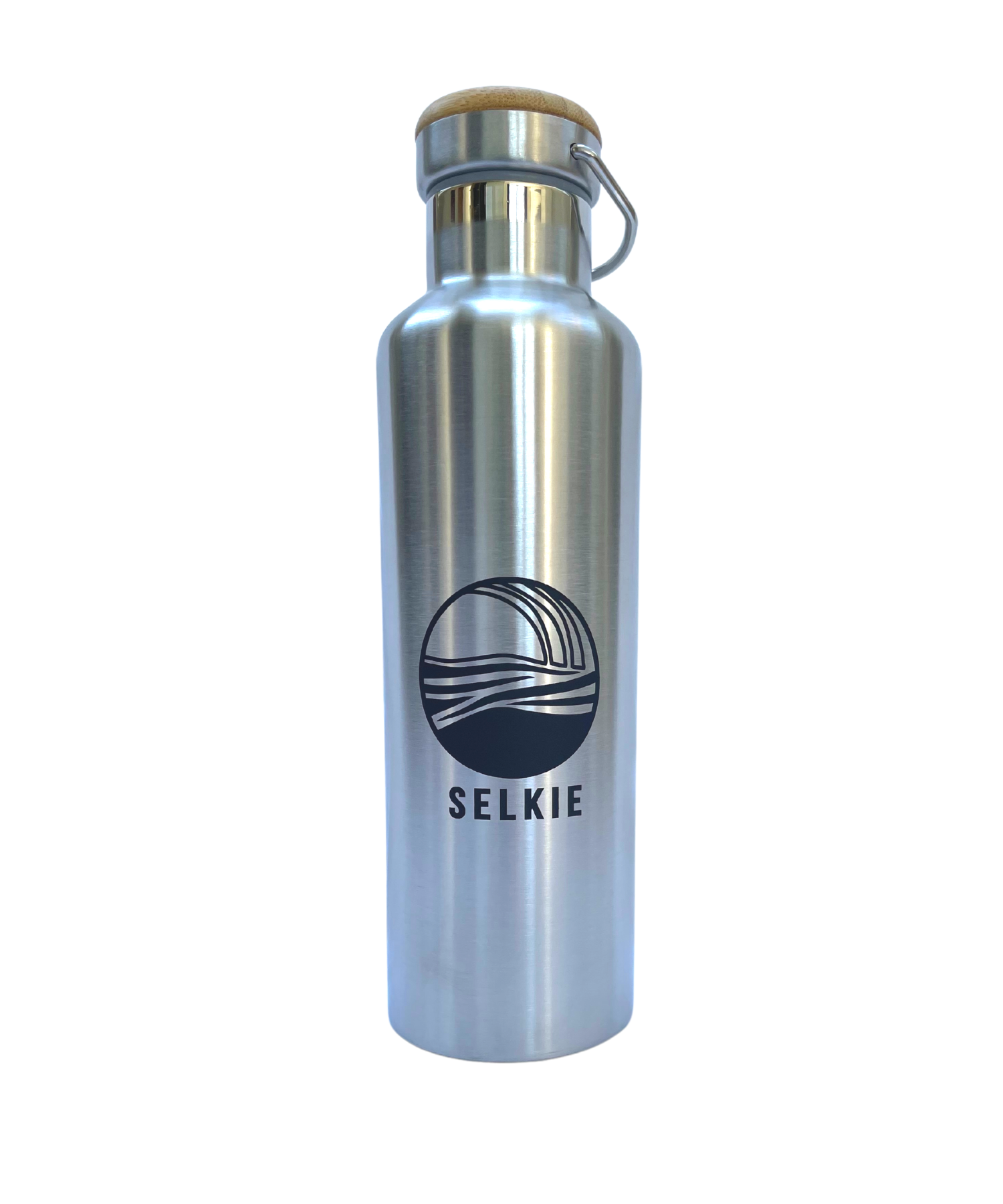 Our sleek brushed stainless steel, 750ml water canteen has a bamboo lid and cool SELKIE branding. An indispensable and eco-friendly outdoor adventure companion.