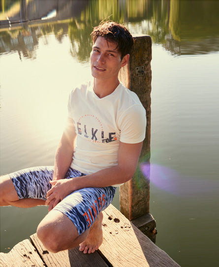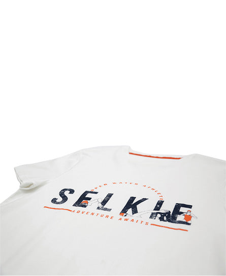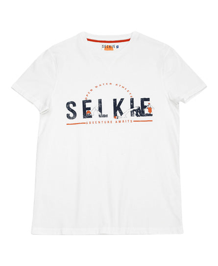 ADVENTURE AWAITS Tee, which features graphics inspired by our open water swimming heritage. A white, slim fit tee made from the softest organic cotton with crew neck, it’s designed for those who swim in untamed rivers, lakes and seas to wear with pride.