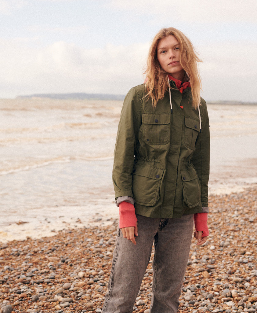 Our 4 pocket jacket style is perfect for this time of year, its practical cotton nylon outer and soft jersey lining makes it a versatile piece. We have added a water repellent finish onto the fabric. It has an internal waist drawcord and large bellow utility pockets, there is also a hidden hood in the collar for those unexpected showers!